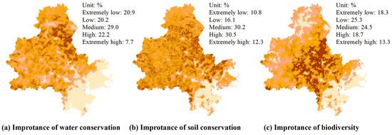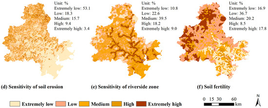 Using the raster calculator and cost–distance analysis tool of ArcGIS 10.6, the spatial distribution of indexes such as ecological service, ecological sensitivity, and soil fertility can be obtained by combining operation and least-cost path analysis. Furthermore, all ecological indicators are graded by applying the natural breakpoint classification method, and the indicator values are divided into five grades: extremely low, low, medium, high, and extremely high (Figure 4). Overall, the importance of ecosystem services is mainly distributed in the areas south of Daiyun Mountain and west of Qingyuan Mountain. The extreme importance of the water conservation service and soil conservation service occurs mainly in the northern region, with Dehua County and Yongchun County as the geographic centers (they occupy 7.7% and 12.3% of the study area, respectively). The extremely important areas of biodiversity appear mainly in the middle of the study area and account for 13.3% of the area. The ecological environment sensitivity is mainly distributed in the northwest of the study area and near water bodies such as rivers, lakes, and reservoirs (see Jinjiang and Luoyang Rivers). The extremely important areas of soil erosion sensitivity and riverside sensitivity account for 3.4% and 9.0% of the total area, respectively. The areas with extremely high soil fertility are mainly located in the northwest of the study area and account for 17.8% of the area.