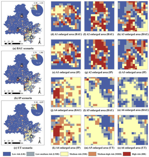 Using the fishing net tool of ArcGIS, the study area was divided into a 600 m × 600 m grid, which we use as the basic spatial unit for expressing ecological risk. We calculate the ecological risk index (ERI) of each risk zone based on the land use scenarios and key ecological factors. The risk at the center of the risk unit is thus obtained and converted into raster data by using ArcGIS (Figure 5). In general, compared with the BAU scenario, the IP scenario leads to the continuous expansion of the high-risk area, the medium-high-risk area, and the medium-risk area, which account for 1.90%, 3.75%, and 8.03% of the study area, respectively. Similarly relative to the BAU scenario, the high-risk area and the medium-high-risk area of the UT scenario continue to decline. Particularly remarkable is that the medium-risk of the UT scenario expands significantly, with its area rising from 7.67% of the baseline to 8.66%. The expansion of industrial and mining lands in the central and northwestern regions produces an increase in high-risk areas (A1–A3), while the expansion of industrial and mining land in the southeast increases the medium-high-risk areas (A4). The expansion of urban construction land in the Quanzhou Bay and South Wing areas undergoes a rapid increase in medium-risk areas (A5 and A6). The industrial expansion in the southern and eastern parts of the study area (the A4 area) contributes to the development of numerous medium-high-risk areas and high-risk areas. In contrast, industrial development in the northwest region results in a significant expansion of high-risk areas. These results provide an important reference for the spatial configuration of industrial projects. The change in the spatial distribution of ecological risk in the UT scenario is mainly attributed to the fact that urban expansion mainly occurs in the Quanzhou Bay area, where the importance of ecosystem services is relatively low. At the same time, with this scenario, some industrial and mining land is converted into urban construction land.