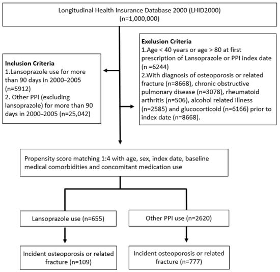 We assembled a study cohort comprising patients who received PPI prescriptions for the first time between 2000 and 2005 (n = 11,716) based on a new user design [25]. The first date of the prescription of PPIs was defined as the index date. Patients who met one of the following criteria were excluded: age younger than 40 or older than 80 years (n = 3455) and diagnoses of osteoporosis or hip fracture before the index date (n = 3398). In addition, patients with diagnoses of rheumatoid arthritis (n = 506), alcohol-related illness (n = 2585), chronic obstructive pulmonary disease (n = 3078), and use of glucocorticoid (n = 6166) during the study period were also excluded. Patients who underwent lansoprazole therapy were defined as the exposed cohort. Meanwhile, patients who received other PPI treatments, including omeprazole, pantoprazole, rabeprazole, and esomeprazole, were defined as the comparison cohort. To control for potential confounders between the two cohorts, we applied propensity score matching at a ratio of 1:4 for exposed and comparison cohorts. The propensity score was calculated for each patient by using a logistic regression model with covariates of age, sex, index date, and baseline comorbidities, including cerebral vascular disease (ICD-9-CM codes 430-438), chronic liver disease (ICD-9-CM codes 570-572), chronic kidney disease (ICD-9-CM code 585), hyperlipidemia (ICD-9-CM code 272), hypertension (ICD-9-CM codes 401-405), diabetes mellitus (ICD-9-CM code 250), malignant neoplasms (ICD-9-CM codes 140-208), and congestive heart failure (ICD-9-CM code 428). Finally, 655 patients with lansoprazole therapy and 2620 patients with other PPI treatments were included in the analysis. Follow-up was initiated from the index date until 31 December 2013, death (based on withdrawal from the NHI), or a first primary diagnosis of osteoporosis—whichever occurred first (Figure 1).