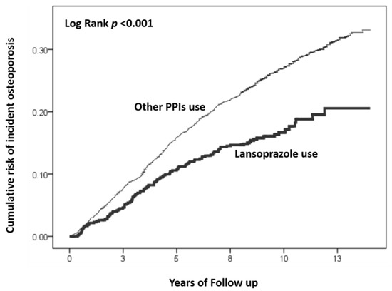 Kaplan–Meier curves for the cumulative risk of incident osteoporosis stratified by the use of lansoprazole and other PPIs with log-rank test.