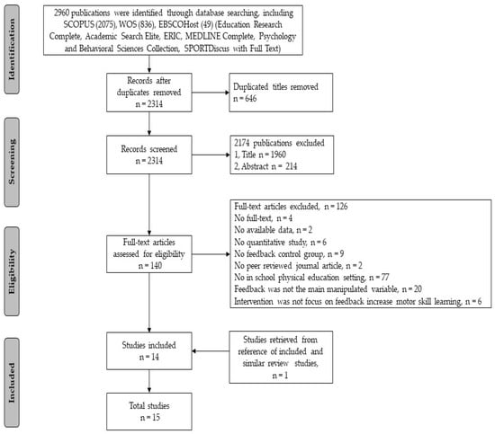 Inclusion criteria: (1) Feedback was used as an intervention technique in general school physical education (PE). (2) The research must use feedback as the main variable and test its effectiveness on changes in students’ motor skill levels. (3) The study was designed as a pretest and posttest with a quantitative approach reflecting causality between feedback (independent variable) and motor skill learning (dependent variable). Primary feedback was used as an intervention technique in the experimental groups, regardless of form or content. Control groups were non-feedback or other secondary feedback. (4) Included articles must be published, peer-reviewed articles in English. Exclusion criteria: (1) Research background was outside the natural setting of school PE and participants were not regular students. (2) Students with disabilities. (3) Studies that did not investigate feedback-induced changes in motor skill learning. (4) Gray literature, including dissertations, theses, reviews, conference proceedings, and unpublished articles.