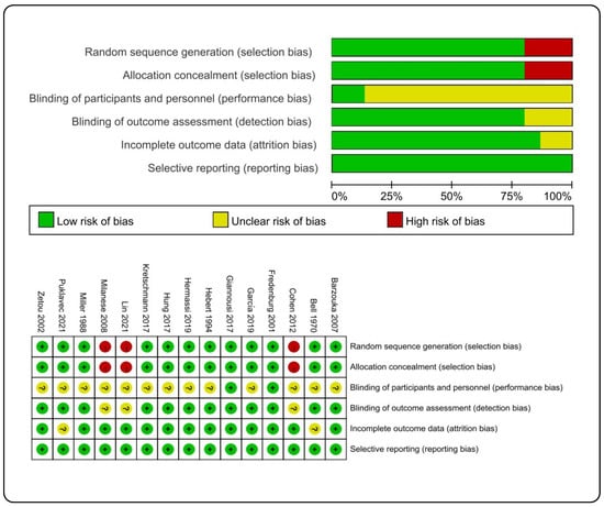 The risk of bias is shown in Figure 2. Twelve studies reported random sequence generation [17,18,20,21,35,36,37,38,39,42,43,44], and twelve studies used the concealed allocation approach [17,18,20,21,35,36,37,38,39,42,43,44]. Only two studies designed the protocol in order that participants were blinded [38,42]. Twelve studies referred to blinding of outcome assessment [17,18,20,21,35,36,37,38,39,42,43,44]. Two studies were unclear about reporting incomplete outcome data [20,35]. Null study related to selective reporting. Two studies were considered to be of high quality [38,42].