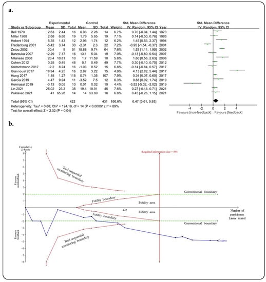 Effect of feedback on motor skill learning across all included studies. (a) Forest plot of feedback vs. non-feedback on motor skill learning. Bell (1970) [35], Miller (1988) [36], Hebert (1994) [37], Fredenburg (2001) [38], Zetou (2002) [39], Barzouka (2007) [21], Milanese (2008) [40], Cohen (2012) [41], Kretschmann (2017) [44], Giannousi (2017) [42], Hung (2017) [43], García (2019) [17], Hermassi (2019) [18], Lin (2021) [19], Puklavec (2021) [20]. (b) Trial sequential analysis to assess the effect of feedback on motor skill learning with two-sided monitoring boundary, α = 5%, β = 20%. Required information size was calculated based on TSA estimation, which was 595.