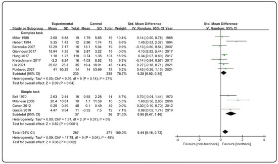 The stability of the result was further tested by performing sensitivity analyses. As shown in Table 3, in terms of the form of feedback, visual feedback (SMD = 0.71; 95% CI 0.14, 1.28; Z = 2.45; p = 0.01) and visual combined verbal feedback (SMD = 1.15; 95% CI 0.26, 2.05; Z = 2.53; p = 0.01) significantly improved students’ motor skills in PE, while verbal feedback (SMD = −0.09; 95% CI −1.01, 0.83; Z = 0.20; p = 0.84) did not significantly change motor skills. Both the self-model (SMD = 1.15; 95% CI 0.00, 2.29; Z = 1.97; p = 0.05) and the expert model (SMD = 0.85; 95% CI −0.01, 1.70; Z = 1.93; p = 0.05) were significantly beneficial for learning motor skills in PE. With regard to the content of feedback, of the three types of content, only corrective feedback (SMD = 1.49; 95% CI −0.02, 3.00; Z = 1.94; p = 0.05) had a significant effect on motor skill learning. In addition, feedback had a significant effect on learning motor skills of different task complexities, as evidenced by significantly improving both complex motor skills (SMD = 0.62; 95% CI 0.10, 1.13; Z = 2.34; p = 0.02) and simple motor skills (SMD = 0.73; 95% CI 0.22, 1.24; Z = 2.81; p = 0.005). The schedule of feedback was mainly regulated by the PE teacher (SMD = 0.74; 95% CI 0.18, 1.30; Z = 2.57; p = 0.01), which significantly improved the motor skills of the students. Subgroup analysis indicated that heterogeneity could be caused by task complexity (Figure 4).