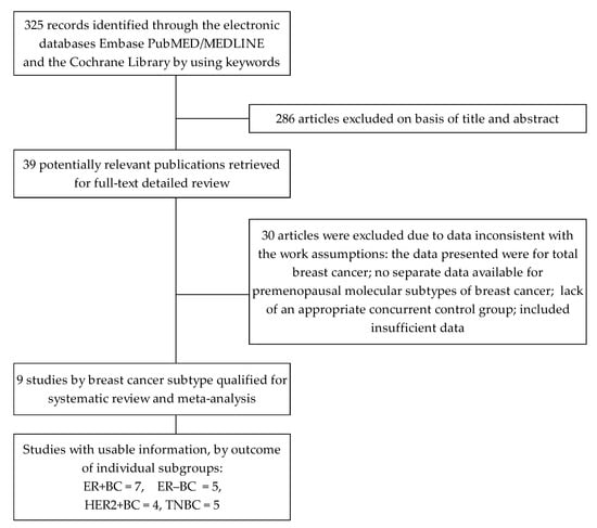 Details of the search and identification process are presented in Figure 1. The search through electronic databases and relevant bibliographies identified 325 articles. Based on the titles and/or abstracts reviewed, 286 items were excluded. The remaining 39 articles with potentially relevant works were then qualified for full-text evaluation. Among these, 30 studies were, among others, excluded due to data inconsistent with the work assumptions, the data presented were for total breast cancer, and no separate data were available for pre-and postmenopausal molecular subtypes of breast cancer, or other reasons. Finally, nine articles were included in the systematic review and meta-analysis.