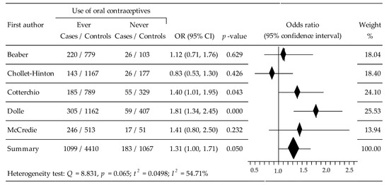 The results of the analysis regarding the association between OC use and the risk of ER−BC subtype were obtained from five studies [34,35,36,39,40], which included 6760 women (cases; 1282, control: 5477). The summary meta-analysis showed that ever-use of OCs generated significantly increased breast cancer risk, compared to non-taking OC: OR = 1.3079, 95% CI: 1.0003 to 1.7100, p = 0.050, with relatively moderate heterogeneity: I2 = 54.71% (Figure 3). No evidence of publication bias was seen after the application of Begg’s test: au b = −0.4000, z = −0.9798, p = 0.327, and Egger’s test: b0 = −3.6523, 95% CI; −12.1087, 4.8040, t = −1.3745, p = 0.263.