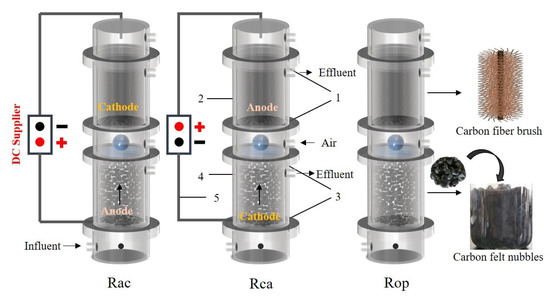 Intermittent electrical stimulation mode was used on four AO-UBERs (12 h ON/12 h OFF), based on our previous studies which demonstrated that intermittent electrical stimulation could be beneficial to maintain greater evenness for functional stability of microbial communities during the treatment processes of biorefractory organics, and most electroactive bacteria are enriched in the intermittent electrical stimulation mode [22,23]. The other two reactors were operated with an open circuit. Each operating condition had two identical reactors. There were three types of reactors: Rac, Rca, and Rop, which are shown in Figure 1. Rac was equipped with anaerobic anodic/aerobic cathodic chambers containing R1 and R2, while Rca was equipped with anaerobic cathodic/aerobic anodic chambers containing R3 and R4. Rop was operated with an open circuit containing R5 and R6.