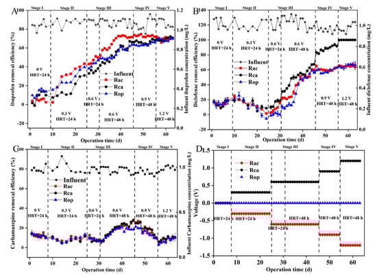 Table 1 summarizes the operational conditions. In stage 1, the six reactors were fed synthetic pharmaceutical wastewater with 24 h of HRT and without voltage application. The system was initiated until the removal efficiencies were stabilized, and as there was a gap between the reactors, it was necessary to group them. The two reactors with the highest pharmaceutical removal efficiencies were used as control reactors with an open circuit Rop, and in stage 2, 0.3 V was applied on the other two kinds of reactors, Rac and Rca. In stage 3, the voltages applied to Rac and Rca were increased to 0.6 V. During the electrical stimulation process, the organic loads were adjusted from 24 h HRT to 48 h HRT, with the aim of judging the effect of electrical stimulation on drug removal in the short term. After the removal, efficiencies were stable under 0.6 V with 48 h HRT condition, and the voltage was sequentially added to 0.9 V and 1.2 V in stages 4 and 5. Previous research suggests 1.23 V is the minimum voltage for hydrogen evolution from electrolytic water and found that excessive voltage (1.2 V) will significantly inhibit the performance of the activated sludge system. In addition, based on our previous research results and the REDOX potentials of diclofenac (0.4–0.7 V) and ibuprofen (redox potential >100 mV) on carbon-felt biocathode, we chose the voltage gradient of 0.3 V, 0.6 V, 0.9 V, and 1.2 V [23,24,25].