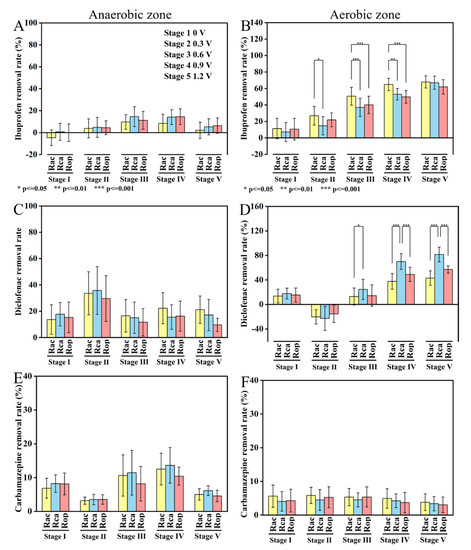 As shown in Figure 3A,B, when all reactors were operated with an open circuit, the average removal efficiency of ibuprofen was 9.70% in the aerobic zones, with negative removal values of ibuprofen in the anaerobic zones. When the voltage was increased to 0.3 V, the contribution of the aerobic cathodic/anodic chambers (26.85%, 14.67%) to the removal of ibuprofen was higher than that of the anaerobic cathodic/anodic chambers (4.83%, 3.89%).The removal efficiency of ibuprofen by the control system was 21.85% in aerobic zones, lower than that of the aerobic cathodic chambers. When the voltage was increased from 0.6 V to 1.2 V, the removal efficiencies of ibuprofen decreased from 14.58%, 9.71% to 5.30%, 1.54% in anaerobic cathodic/anodic chambers. The removal efficiencies of ibuprofen increased from 50.59%, 36.91% to 67.87%, 66.95% in the aerobic cathodic/anodic chambers, higher than in the control system (40.04–61.97%) (p < 0.05).