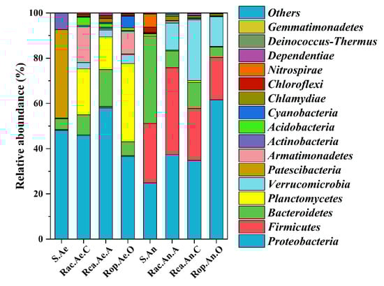 Eight specimens, including the original inoculating seed sludge and biofilms at the last stage, were gathered in order to conduct analysis of the bacterial communities. S.An and S.Ae were assigned to the samples taken from the original anaerobic and aerobic sludge, Rac.Ae.C, Rca.Ae.A, and Rop.Ae gathered from the aerobic zones of Rac, Rca, and Rop, and Rac.An.A, Rca.An.C, and Rop gathered from the anaerobic zones of Rac, Rca, and Rop, respectively. The total number of bacterial communities was determined using real-time quantitative polymerase chain reaction (qPCR). Biofilms were collected from the cathodic and anodic chambers of the AO-UBERs and were used to quantify the total bacteria and 16S rRNA gene copy numbers per gram carbon-fiber brush or gram carbon-felt nubble to determine target bacterial abundances. For high-throughput sequencing, 16S rRNA genes were amplified using primers 515F (5′-GTGCCAG CMGCCGCGGTAA-3′) and 806R (5′-GGACTACHVGGGTWTCTAAT-3′) targeting the V3–V4 chamber of the 16S rRNA gene. The DNA extraction and qPCR procedures were identical to those published in our earlier study [19].