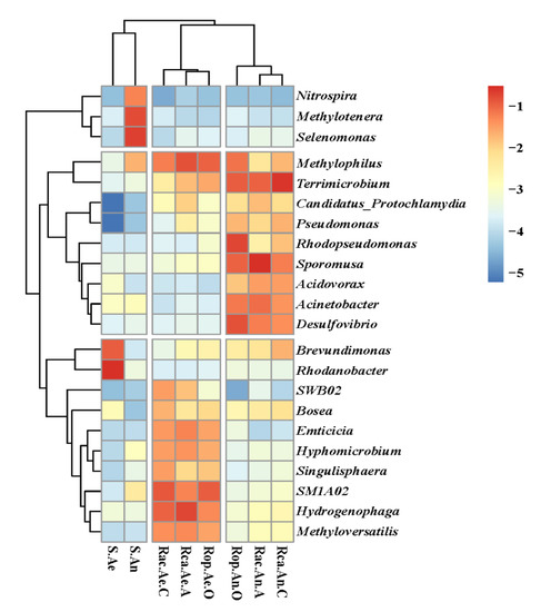 Heatmaps of bacterial communities of the eight samples at the genus level. S.Ae and S.An were collected from initial aerobic and anaerobic sludge; Rac.Ae.C, Rca.Ae.A, and Rop.Ae.O, were collected from the aerobic zones of Rac, Rca and Rop; Rac.An.A, Rca2.An.C, and Rop.An.O were collected from the anaerobic zones of Rac, Rca, and Rop.