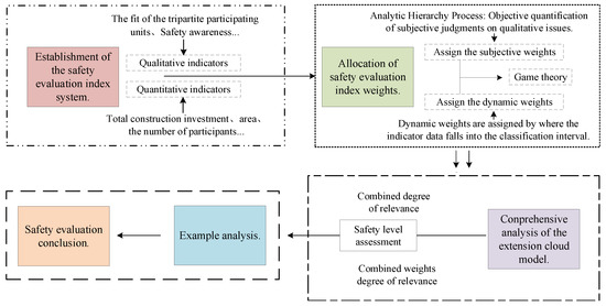 The research methodological framework of this paper is as follows: (1) Establishment of the safety evaluation index system. (2) Allocation of safety evaluation index weights. (3) Comprehensive analysis of the extension cloud model. (4) Example analysis. (5) Safety evaluation conclusion. The specific research method framework is shown in Figure 2.