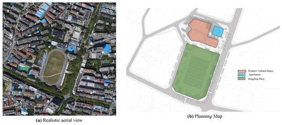 The Yueyang Workers’ Cultural Palace and Dongfeng Square were transformed into a comprehensive service place, integrating leisure, entertainment, culture, education, sports, fitness, and business offices. The construction includes a workers’ cultural palace, a standard sports field, two underground parking lots, roads, squares, surface parking spaces, greening, an outdoor pipeline network, and other supporting facilities. Through on-site research and expert discussions, engineering evaluation volume values were determined, and data of each index are shown in Table 7. The surrounding environment and planning of the project are shown in Figure 4.