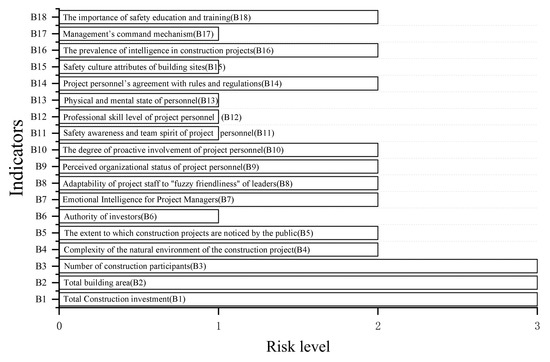 Calculated by a formula similar to that of Example 1, . The weights are assigned as shown in Table 11. The combined correlations of indicators are shown in Table 12. The risk level of each indicator is shown in Figure 6. The calculation of the safety level is similar to that of Example 1. , i.e., selected project is at a medium risk level.