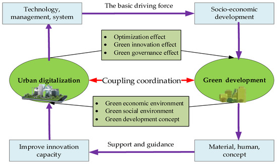 We present the theoretical framework for the coupling coordination between urban digitalization and green development in Figure 1. The relationship between urban digitalization and green development is one of mutual promotion, and it is a long-term and dynamic historical evolution. Urban digitalization provides the impetus and guarantees for green development. Urban digitalization promotes economic and social development, transformation and upgrading by promoting technological innovation, management innovation and system upgrading, thus, driving green development. Green development has created a favorable development environment for urban digitalization and sets the current targets for it. Green development can also attract high-quality material and human capital, increasing its popularity, and thus, provide strong support and guidance for urban innovation capacity improvement and further promote urban digitalization.