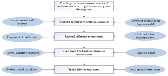 In the context of low-carbon globalization, green development has become an international focus. Green development is a current mode of development featuring resource conservation, environmental friendliness and social progress, which can realize ecological benefits and guarantee economic and social benefits, including the three core elements of “economic development, resource conservation and environmental protection, and social welfare enhancement”, and pay more attention to the unity and coordination of economic development, social progress and ecological construction [1]. Countries and regions have stepped up their investments in green development, focusing on carbon neutrality and clean energy and actively shaping the capacity building and competitive advantages for green development. Currently, green development is an inevitable choice for the high-quality development of Chinese cities, and it is also the only way to meet people’s growing demands for a better ecological environment [1]. Urban digitalization has become a dominant trend in the economic and social development of various countries. It refers to the use of 5G, big data, artificial intelligence and other digital technologies to focus on the key areas and core links of urban operations, and to promote the comprehensive remodeling of economic society and urban governance [2], which is the key for cities to build core competitiveness in the digital revolution. China also regards digitalization as an important focus for high-quality urban development. The outline of China’s 14th Five-Year National Economic and Social Development Plan precisely proposes the acceleration of digital development and the building of a digital China. At the same time, it has made a series of strategic arrangements to create new advantages in the digital economy, accelerate the construction of a digital society, raise the level of digital government construction and create a sound digital ecology. Shanghai, Beijing and other local governments have also issued policies related to urban digital transformation, such as Shanghai’s Opinions on Comprehensively Promoting Urban Digital Transformation in Shanghai, and Beijing’s Implementation Plan on Accelerating the Construction of a Global Digital Economy Benchmark City. Green development emphasizes both environmental protection and efficiency, while digital technology can considerably improve efficiency on the premise of ensuring environmental protection by fostering a more flexible and efficient new economy, new forms of business and new driving forces [3]. Therefore, it is of great theoretical and practical importance to accurately understand the coordination relationship between urban digitalization and green development (CD&GDD), and to quantitatively analyze it, which has a certain reference value for the formulation of urban development policies and the implementation of differentiation strategies.