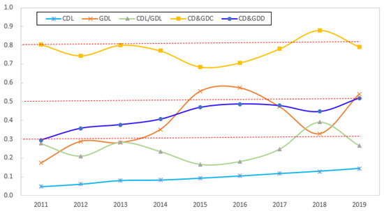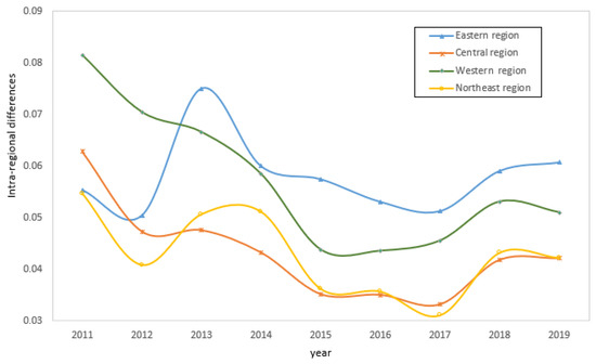 Figure 5 presents the CD&GDD Gini coefficients for the four economic zones from 2011 to 2019. During the observation period, the mean values of the CD&GDD Gini coefficients for the four economic zones showed an overall decrease, which was accompanied by some fluctuations. The intra-regional differences in the CD&GDD levels were the largest but were relatively stable in the eastern region, which was followed by the western region, which had the largest range of fluctuations. The intra-regional differences in the CD&GDD levels were not high in the central and northeastern regions, but both need to be further stabilized. Regionally, the intra-regional Gini coefficient in the eastern region expanded rapidly before 2014, then decreased and tended to stabilize, which indicates that the CD&GDD difference in the eastern region became increasingly large before 2014 and had a converging trend after that. Prior to 2016, the intra-regional difference in the west showed a sharp downward trend, falling from 0.0805 in 2011 to 0.0435 in 2016, but it has significantly recovered since 2017. The intra-regional differences between the central and northeastern regions were relatively close and fluctuated continuously, but there was a downward trend overall. The above results once again confirm the problem of the imbalanced development within each region at the CD&GDD level in China, and the need to combine the development characteristics of each region in the formulation of coordinated regional development policies.