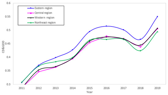 Figure 4 presents the basic characteristics of the CD&GDD for the four major economic zones in China from 2011 to 2019. Overall, the CD&GDD levels are substantially higher in the eastern regions than in the central, western and northeastern regions, and the CD&GDD levels considerably vary from region to region. Although there is a strong correlation between urban digitalization and green development, a mature and stable interactive development relationship between the two has yet to be established due to the short development time of urban digitalization and the low integration of digitalization with traditional economic and social development. From a time series perspective, the CD&GDD of the four economic zones all show a fluctuating upward trend, which indicates that the benign interplay between digitalization and green development will continue to improve as urban digitalization develops and its broad penetration into the economy and society continues. By region, the CD&GDD in the eastern region is higher than the national average, increasing from 0.3069 in 2011 to 0.5499 in 2019, with an average annual growth rate of 8.8%. The CD&GDD in the central and western regions are extremely close to and slightly below the national average, increasing from 0.2865 and 0.2864 in 2011, respectively, to 0.5060 and 0.5070 in 2019, respectively, with an average annual growth rate of 8.5%. The CD&GDD in northeast China fluctuated considerably, with a mean value higher than those of central and western China from 2011 to 2015, but lower than those of central and western China after 2015. The gap has gradually widened, increasing from 0.3083 in 2011 to 0.4953 in 2019, with an average annual growth rate of 6.74%.