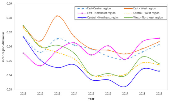 Figure 6 presents the CD&GDD Gini coefficients between the four major economic zones from 2011 to 2019. From a time-trend perspective, the CD&GDD Gini coefficient was in a state of continuous fluctuation between the regions, but it showed an overall downward trend. The central and northeastern regions experienced the largest reduction in regional variation, with a decrease of 56%. The eastern and central regions showed the smallest decrease in regional variation, with a decrease of 8.83%. The difference between the central–western and western–northeast regions also decreased by more than 50%. The east–northeast regional Gini coefficient showed an expanding fluctuation trend, which indicates that, in the east and northeast cities, the digitization and the development of the green policy enforcement and their effects are not consistent and need additional promotion, according to the features of the development of the two regions, to develop more targeted policies and measures to narrow the CD&GDD differences between the regions. During the observation period, the difference between the eastern region and other regions was substantially higher than the differences between the other regions. The east–west group had the largest difference, with an annual average difference of 0.0645. The central and northeastern regions had the smallest difference between the groups, with an annual average difference of 0.0450. The differences between the other four groups of regions were all above 0.05. According to the above information, the level of the CD&GDD considerably varied from region to region, which is in agreement with previous analyses.