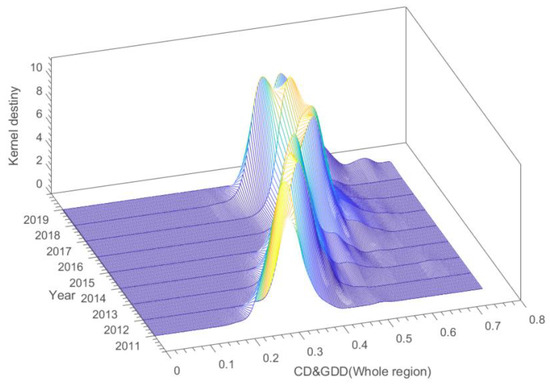 Figure 7 presents a 3D kernel density map of the full CD&GDD sample from 2011 to 2019. For the whole sample, the main peak of the kernel density curve is distributed on the right side of the curve, which indicates that most Chinese cities have high CD&GDD levels. At the same time, the CD&GDD distribution shows a trend to the right, which indicates that the CD&GDD levels in most Chinese cities are on an upward track, and that urban digitalization and green development have been effectively coordinated overall. The shape of the nuclear density curve is relatively stable; the width of the peak also varies with the fluctuation in the peak and there are no clear peaks, troughs or single or double peaks, nor is there a clear polarization trend. The Chinese government regularly attaches great importance to the development of green and digital construction. In 2017, it formally implemented the acceleration of the development strategy of a digital China and Chinese construction wisdom, and local governments are increasingly paying attention to coordination with the development of green city digitalization and the effective integration of the central and local governments to promote, from city to city, the overall increase in the digitalization construction and green development level. The regional difference and polarization trend have been effectively alleviated, and the degree of spatial equalization has been substantially improved. However, given the differences in the resource endowments and environmental constraints in the different regions, the gap between the coupling coordination development of the two regions still exists, which should be continuously noted.
