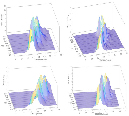 Three-dimensional kernel density maps of CD&GDD in four economic zones.
