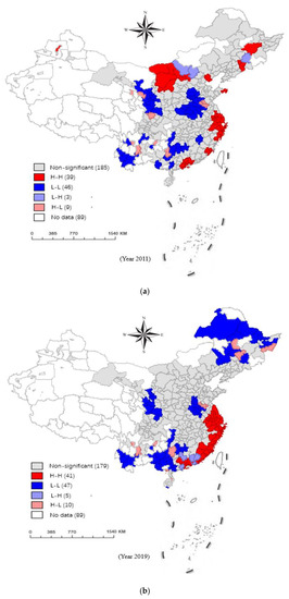 The local Moran’s I can divide the local spatial correlation between the target city and its surrounding cities into four quadrants of spatial agglomeration, and the significance degree is represented by the LISA significance test. The first type is that the level of the city and its surrounding cities is high, referred to as high-high (H-H); the second type is the low level of the city and its surrounding cities, referred to as low-low (L-L); the third category is that the city has a high level and is surrounded by low-level cities, referred to as high-low (H-L); the fourth type is that the city has a low level and is surrounded by a high-level city, which is referred to as low to high (L-H). Within the research space, if the local Moran’s I index is less than 0, it means that the spatial units with different attribute values of “L-H” and “H-L” are clustered together. If the local Moran’s I index is greater than 0, it means that the spatial units with similar attribute values of “H-H” and “L-L” are clustered together [82].