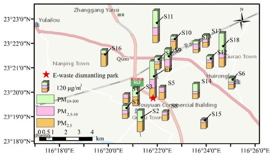 The spatial map of PM2.5, PM2.5–10, and PM10–100 concentrations in the e-waste dismantling park and the surrounding residential area. S1–S18 and EP were labels of sampling points.