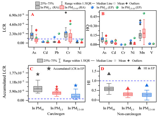Life cancer risks (LCR) of single metal (A), hazards quotient (HQ) of single metal (B), the accumulated LCR of five metals (C), and hazards index (HI or accumulated HQ) of six metals (D) in PM2.5 and PM2.5–10. EP: e-waste dismantling park; RA: the surrounding residential areas; the blue dash lines: the safe threshold of LCR and HI.