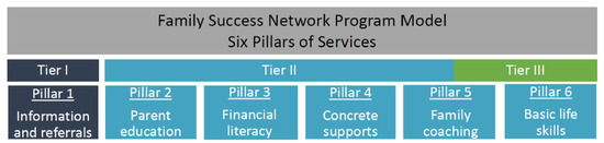 The main components of the FSN focus on parent–child relationships and financial needs to address intergenerational trauma and buffer immediate financial hardships. Tier I focuses on the provision of information and referral services to connect participants to community resources. Tier II encompasses Tier I services in addition to parent education, financial literacy, concrete supports (e.g., material goods, transportation tokens, financial assistance, etc.) and family coaching. Tier III is the most comprehensive and provides family coaching, home visits and basic life skill support in addition to Tier I and II services. All services are voluntary, and families may fluidly move between Tier II and Tier III depending on their preferences for the level of engagement with the program and their family needs. Parenting skill-building is addressed through the Triple P parenting program. Triple P provides parents with education and support for children’s behavioral and social development by equipping parents to address the behavioral problems of their children while concurrently strengthening parent–child relationships. Additionally, intergenerational trauma and relational health are addressed through family coaching and assessments of past family traumas using the Adverse Child Experiences (ACE) Study [30], the Brief Child Abuse Potential Inventory (BCAP) [31], and the Protective Factors Survey 2nd Edition (PFS-2) [32].
