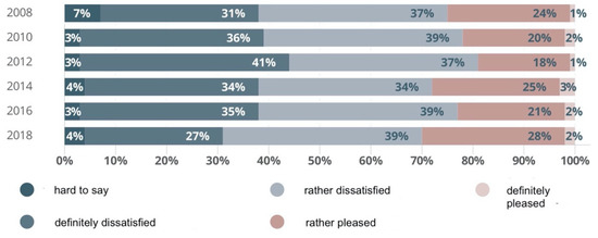 In the years 2019–2020, we can observe that the number of beds has been slowly going down in Poland [16]. This is, however, mainly due to new legal provisions on the required number of employed nurses per one hospital bed. Increasing demand for professional nursing care is closely correlated with changing demographics. Forecasts assume higher spending levels in the healthcare sector by about 100% in the next 34 years. The control made by the Polish Supreme Chamber of Control upon an order from the Ministry of Heath shows that the declining number of hospital beds has failed to translate into the satisfaction of patients from the quality of medical services. On the contrary, their dissatisfaction continues to be very high. Yet, it can be observed that the group of satisfied patients grew by 4% in the inspected period (2008–2018), at the same time, the number of dissatisfied patients proportionately went down (Figure 3). Thus, decisions made by architects should be more and more accurate and conscious. They should, moreover, be the knowledge-based decisions in view of the needs of all co-participants of the process.