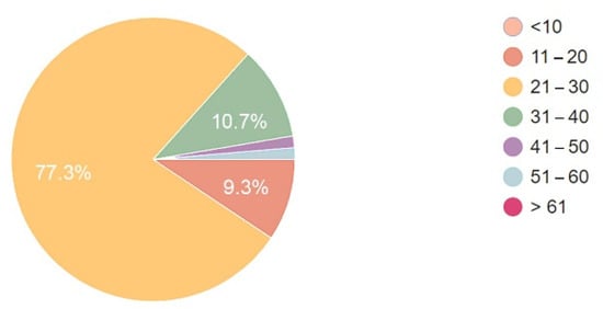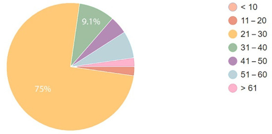 The data collected in the two groups showed that over 3/4 of respondents were aged from twenty-one to thirty (Figure 8 and Figure 9). The data collected in the two groups showed a slight difference as regards other age ranges. In the group of patients, none was in the age over 61.