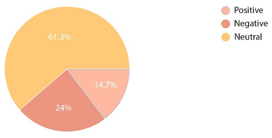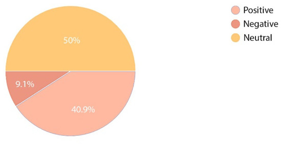 The survey next moved to analyse the emotions invoked by the environment of an orthopaedic and rehabilitation hospital in persons hospitalised or working therein. Three options were envisaged: positive, neutral, and negative. The obtained results clearly show a difference between the feelings of medical staff and patients. A large majority of the respondents had a neutral emotional attitude to the hospital; however, comparing answers provided by the group of hospital employees and patients, it can be noted that the two groups absolutely disagreed. Medical staff assessed their work positively (40.9%) and only 9.1% voiced a negative opinion (Figure 10), whereas only 14.7% of the patients had a positive opinion regarding their stay in hospital and 24% were of a negative opinion (Figure 11).