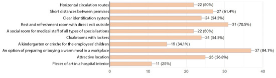 For medical staff the most important was an option of preparing or buying a warm meal in a workplace (84.1% of the respondents). This was followed by a rest and refreshment room with a direct exit to outside. A proportion of 70.5% of the respondents selected that option. The sequence of other selected options was as follows: short distance between premises (61.4%), attractive location (56.8%), and cloakrooms with lockers (54.5%). During our site visit, we learnt that the hospital staff highly approved of the locker system, yet they stressed that the number of lockers was insufficient. The respondents also thought that the following were important: horizontal circulation routes (50%), a social room for medical staff of all types of specialisations (50%), and a kindergarten or crèche for the employees’ children (34.1%). Pieces of art in a hospital interior were viewed as the least important. Only 11 persons ticked that option, i.e., 25% (Figure 12).