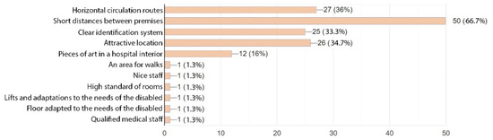 Patients’ answers also included suggestions as to what they viewed as required in an orthopaedic and rehabilitation hospital (Figure 13). Among the listed items were: an area for walks, high standard of rooms, nice and qualified staff. In the surveyed group of patients, short distances between premises or doctor’s offices were viewed as a top priority (66.7%). Horizontal circulation routes ranked similarly to an attractive location (36% and 34.7%, respectively) and were followed by a clear identification system (33.3%). Like medical staff, the patients also thought the least of art pieces displayed in the hospital interior; nonetheless, this option was selected by 12 respondents (16%).