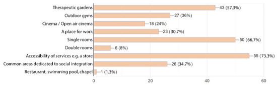 The patients were asked about additional functions missing in the hospital concerned or well-proven in other similar facilities (Figure 14). An absolute majority of respondents thought that access to medical services was the most important criterion (73.3%). The majority of the respondents preferred single rooms (66.7%) to double rooms (only 8%). Therapeutic gardens (57,3%), outdoor gyms (36%), and common areas dedicated to social integration (34.7%) also ranked high. Of the respondents, 30.7% thought a place for work could be useful and 24% would be happy to have an open air cinema. One person suggested a chapel.