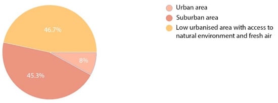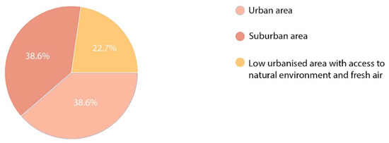 Another question was addressed to the two groups of respondents and referred to a location that might be work-stimulating or recovery-stimulating during the patients’ hospitalisation or stay in an orthopaedic and rehabilitation centre. The obtained results differed depending on the purpose of the respondents’ presence in the facility concerned. Location of a work facility in an urban or suburban area seemed to be the most attractive factor for the employees (Figure 15). Yet, urban and suburban locations were similarly assessed (38.6% of the respondents). Only one in ten of the respondents would choose a facility in a low-urbanised area (22.7%). Opposite opinions were voiced by the patients. Here, a suburban location and a low urbanised location scored similar results (45.3% and 46.7%, respectively), whereas the lowest number of patients were interested in staying in a hospital or healthcare centre in an urban area. Only six persons, i.e., 8% ticked that option (Figure 16).
