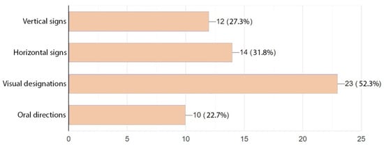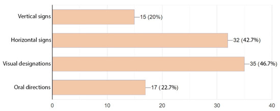 Answers provided to the last question show what hospital signposts were deemed the most legible and easy to understand for the respondents. Here, both the patients and medical staff were in line and highly rated visual signs. This option was followed by horizontal signs (both groups were again concordant in this respect). The above results lead us to conclude that signs that are easily spotted, simple to understand, and lead directly to the destination are most friendly for the patients and medical staff.