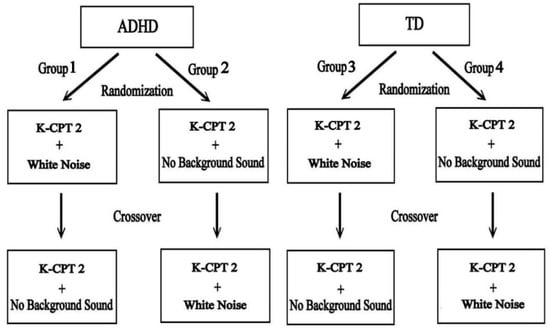 A two-stage randomized crossover design was applied in the present study for both children groups to balance the order of the two experimental conditions (computerized attentional test with and without background white noise) (Figure 1). The crossover design provides statistical power, as different subjects may respond to large variations in the intervention, while variation within the same subjects may be significantly less []. All participants had to complete the computerized attentional test twice; the crossover design could decrease the impact of learning and fatigue effects in performing this sustained attention test. Thus, the within-subjects comparison provided by the crossover design produced a more accurate estimate of the attentional performance in this study.