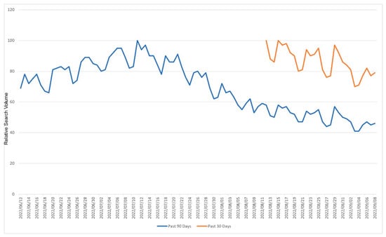 Google Trends results for ‘Coronavirus disease 2019′, retrieved on 12 September 2022 from the Google Trends platform (https://trends.google.com/) based on Worldwide web searches. The data retrieval period was set to the ‘past 90 days’ (blue line) and the ‘past 30 days’ (orange line).