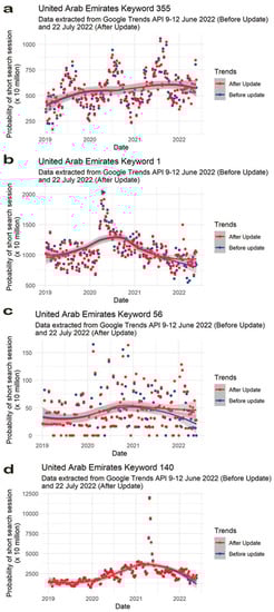 Statistical analyses were performed in R (R Core Team, v4.2.0, 2022), using RStudio Integrated Development for R. The raw data extracted were plotted as two separate time series, applying locally estimated scatterplot smoothing (LOESS) to visually identify potential trends. Spearman correlation was used to determine the correlations between data obtained from the two data extractions and summarized. Thereafter, a new time series was constructed by calculating the difference between the values retrieved via the Google Trends API before and after the updates occurred on 18 July 2022. These time series of differences were also plotted. Anomalies (datapoints that are outside the normal fluctuation range of a time series) in the different time series were detected using the AnomalyDetection package for R [] and the anomaly time series were plotted using the internal plotting functions of R, as well as ggplot2 [].