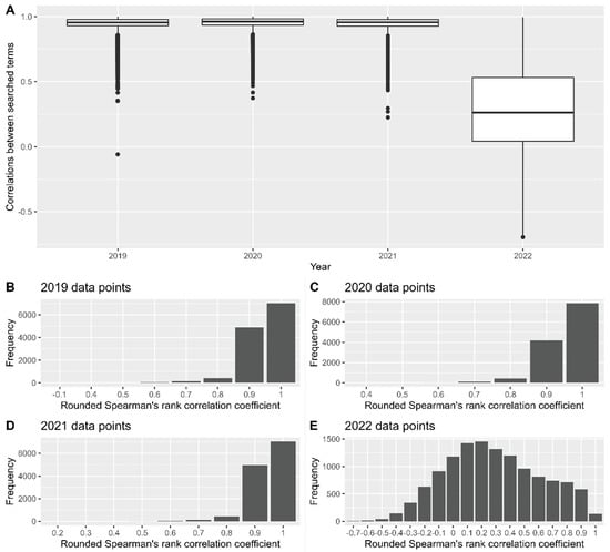 Summary of Spearman’s rank correlation coefficients between 421 terms in 30 countries before and after the implementation of changes to the Google Trends API. (A–D) are indicative of highly correlated values for data extracted for 2019–2021, with low levels of correlation in 2022 (E).