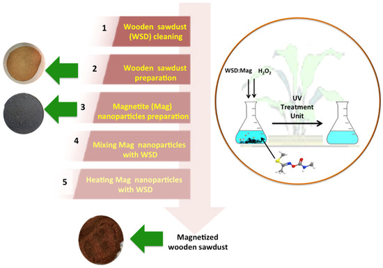 Mag nanoparticles and treated WSD were mixed together in a proportion of 1:2 of magnetite to cellulosic WSD. Subsequently, an agate mortar was used to grind the mixture and the blend wetted with droplets of distilled water, then exposed to 5 min of heating in a microwave oven. The resultant composite was a brownish homogeneous mixture. An illustration of the WSD:Mag preparation steps and application is given in Figure 1.