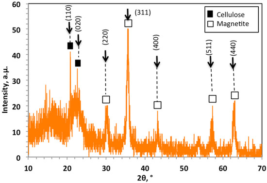 Figure 2 displays the XRD patterns of the prepared WSD:Mag nanoparticle composite in 2θ range from 10° to 70°. Cellulose and magnetite crystalline materials were defined, and the crystalline planes were identified. These crystalline phases in the XRD pattern of Figure 2 showed two sharp peaks of cellulose I at 2θ (degrees) of 22.4° and 2θ of 15.6°, which corresponded to (101) and (002) lattice planes [3,22]. Moreover, the magnetite nanoparticles displayed by diffraction peaks at 2θ (degrees) of 30.15°, 35.61°, 43.25°, 57.37°, 62.81°and 71.33° corresponded to the Miller indices (220), (311), (400), (511) and (440), respectively, which confirmed the crystal phase of Fe3O4 nanoparticles with a spinel structure [23,24].