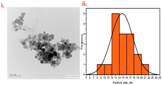 The composite material of cellulosic sawdust fibers (WSD) and magnetite (Mag) nanoparticles were investigated (Figure 3i). TEM data showed that the nonuniform sheet morphology indicated the presence of cellulosic sawdust material. The synthesized Fe3O4 nanoparticles were nearly spherical and augmented the sheet-like particles of the cellulosic sawdust. The particles of magnetite were dense and dispersed in a nonuniform coverage of the WSD surface. Figure 3ii shows the particle size distribution histogram. The recorded average particle size was 14.7 (nm), which is quite a reasonable size to offer a high surface area for the photocatalytic reaction.