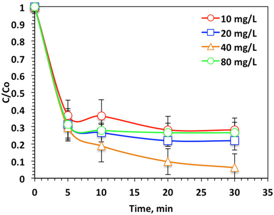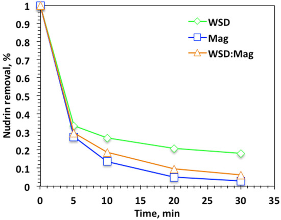 Experimental parameters influencing the reaction kinetics were explored, starting with the experimental reaction time. The influence of Fenton oxidation was examined through Nudrin removal efficiency. Initially, experiments were undertaken for reaction times ranging from 5 to 30 min to explore the reaction time for various systems—WSD/H2O2, Mag/H2O2, and WSD:Mag/H2O2—keeping the initial Nudrin concentration at 50 ppm and 40 and 400 mg/L of WSD and Mag, respectively, at a solution pH of 3.0. Data in Figure 4 reveal that the effect of reaction time on the profile of Nudrin oxidation varied once the oxidation system was altered, i.e., WSD/H2O2, Mag/H2O2, and WSD:Mag/H2O2. A higher initial oxidation drop was achieved in the first 5 min for all applied systems and subsequently steadily decreased; however, the final oxidation was obtained at 30 min of irradiance time. Overall, the magnetite-based Fenton reaction system showed higher Nudrin removal efficiency, which reached 97%. However, the WSD:Mag-based system still exhibited high removal efficiency (93%) in comparison to the WSD-based system, which showed only 82%. The rapid oxidation in the initial time period was associated with ˙OH radicals generation that might have steadily diminished with time. A reduction in hydrogen peroxide reaction occurred with time, and the creation of other less active radicals, such as hydroperoxyl radicals (HO2), which inhibited the oxidation rate rather than enhancing it. Therefore, the Nudrin oxidation capacity is declined as time elapsed. As the reaction proceeded, hydroxyl free radical loading declined corresponding to the decline in hydrogen peroxide [25,26]. Results of Thabet et al. [24] and Soliman et al. [8] verify such results.
