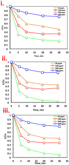 For practical use and real-life applications, it was essential to check the various Nudrin loading on the oxidation system. For the different systems, namely, WSD/H2O2, Mag/H2O2, and WSD:Mag/H2O2, the initial Nudrin loading was investigated and the results are displayed in Figure 4. For the all systems in Figure 5i–iii, the same rate of rapid oxidation was recorded in the initial time period, but the oxidation rate declined with increasing Nudrin load. The removal efficiencies are 93%, 65%, 55%, and 26% using the WSD:Mag/H2O2 for 50, 100, 200, and 500 ppm of Nudrin, respectively (Figure 5iii). A similar trend was achieved for all the systems, whereas the oxidation efficiency declined from 97% to 27% with the increase in Nudrin loading from 50 to 500 ppm, respectively, for the solo magnetite-based Fenton system (Figure 5ii). The WSD/H2O2 exhibited a reduction from 81% to 23% with the Nudrin loading increase from 50 to 500 ppm, respectively (Figure 5i).