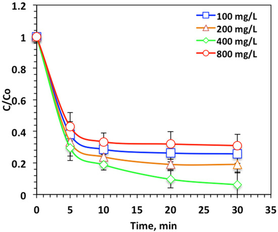 The effect of the H2O2 loading on the Nudrin removal from pesticide-containing aqueous solution is displayed in Figure 6. As expected, a pronounced increase in the oxidation efficiency was obtained with increasing the peroxide reagent dose from 100 to 400 mg/L. The oxidation efficiency increased from 74% to 93% with hydrogen peroxide concentration increase. Although an excessive concentration of peroxide dosing reached 800 mg/L resulted in a decline in Nudrin oxidation efficiency to 69%. This enhancement in the oxidation rate with the increasing hydrogen peroxide dose is associated with the extra ˙OH radical generated due to hydrogen peroxide decomposition [7]. Conversely, in the case of excessive hydrogen peroxide dosing, the radical generated is instead the hydroperoxyl radical (HO2˙), which has insignificant oxidation capabilities and is weaker than the ˙OH radical. Hence, the oxidation reaction rate declined as the highly oxidizing radical (OH) yield declined [24]. The optimal operating H2O2 concentration was found to be 400 mg/L for maximum Nudrin removal for the photo-Fenton-like modified system. Previous findings confirm this result. For instance, Raut-Jadhav et al. [28], Tamimi et al. [29] and Mico et al. [30] found the oxidation rate declined with H2O2 concentrations in excess of the optimum dose for the homogeneous Fenton systems.