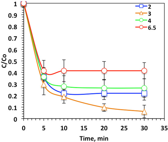 As previously mentioned in the literature cited [32], the photo-Fenton oxidation system is sensitive to the pH of the aqueous medium. Thus, various pH values were studied to check the effect of altering the Nudrin effluent pH on oxidation efficiency. Figure 8 shows that changing the pH value form the original aqueous solution pH (6.5) to the acidic medium (4.0, 3.0, and 2.0), resulted in a decline in pH to the acidic value corresponded to an increase in Nudrin oxidation to 73% (at pH 3.0) compared to 58% (at pH 6.5), although further decline in pH to 2.0 resulted in a reduction in Nudrin removal to 78%. This result could be related to the photo-Fenton-like oxidation system working in an active manner in the acidic solution pH [33], but increasing the pH into the alkaline range results in a decline in the oxidation. This investigation is related to the pH point of zero charge—pHPZC. Commonly, the pHPZC of the WSD surface is positioned to be near the neutral value of 6.7 [23,32]. Thus, the surface of WSD is positively charged. However, elevating the solution pH into the alkaline range might weaken the attraction between the WSD and Nudrin molecules and thus the oxidation rate is declined. However, at the acidic pH, an electrostatic attraction between the positively charged WSD and the Nudrin molecule was obtained and thus the oxidation rate was enhanced. A similar study revealed such a result in treating vanadium [34]. Therefore, pH was adjusted to acidic (pH 3.0) in the further work conducted.