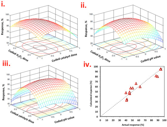MATALB software was used to produce response surface plots. In Figure 9i–iii, the response surface plots are displayed and represented as a function of X1 (H2O2) and X2 (WASD:Mag) (Figure 9i), X1 (H2O2) and X3 (pH) in Figure 9ii and X2 (WASD:Mag) and X3 (pH) in Figure 9iii.
