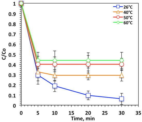 Examination of Figure 10 reveals that over the temperature range 26 °C to 60 °C, a significant reduction in Nudrin oxidation removal efficiency was found. This was attributed to the H2O2 decomposes into O2 and H2O at high temperatures, which further inhibited hydroxyl radical generation, the horsepower in the Fenton oxidation system. The result was an inhibition in the overall reaction rate [36,37]. Previous studies [38,39] found temperature had a small effect on Fenton systems; however, other research confirmed that the optimum temperature for Fenton systems is 17–38 °C [35,40].